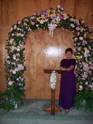 The arch comes alive with over 1500 tiny lights, and it and other decor in the chapel can be altered to reflect the season in which your marriage is held. At Christmas, Janice often decorates the arch with poinsettias. You may also request a special theme that may be particularly important to you and your groom. The Isle of Wight Wedding Chapel servers all of Hampton Roads. We get many guests from Virginia Beach, so wherever you are, come get married at the chapel!